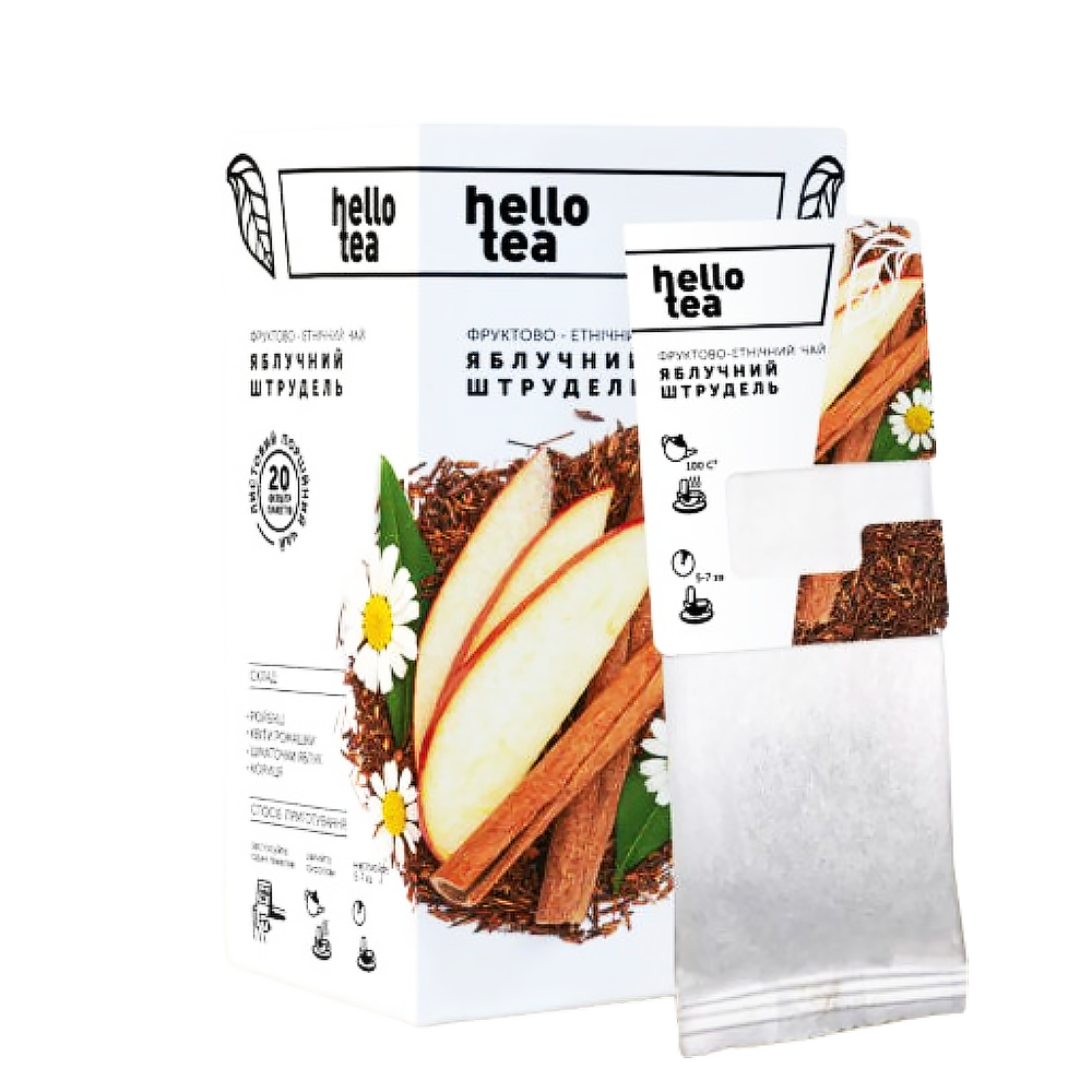 Чай Hello Tea Яблучний штрудель - це яскраве нагадування про ароматний яблучний пиріг з пряною корицею. Його ніжний смак наповнений атмосферою тепла та затишку, так що чай стане ідеальним доповненням до вашого домашнього вечора. Крім смакових якостей чай має низку корисних властивостей, серед яких детоксикація організму, покращення роботи імунної системи, покращення мозкової діяльності тощо. На нашому сайті можна купити чай фруктовий Hello Tea Яблучний штрудель, фільтр-пак 20 шт оптом та в роздріб. Чай упакований у фільтр-пакети із зручним тримачем для вушка чашки. На відміну від кави, яку треба ще вміти правильно приготувати, заварювання чаю не складе великих зусиль. Спосіб приготування: для кращих смакових результатів рекомендується заварювати чай гарячою водою (приблизно 100°C) протягом 5-7 хвилин.