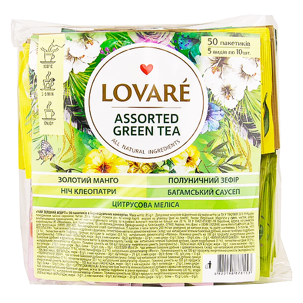 Чай зеленый LOVARE - Ассорти 50х1,5г Оригинальный подарок всем поклонникам качественного напитка – эксклюзивный пакетированный чай в индивидуальных конвертах. «Багамский саусеп» Изысканная бодрость деликатного зеленого чая, тонкий вкус и свежий аромат экзотического саусепа подчеркнуты нежностью лепестков яркой календулы. «Ночь Клеопатры» Тонизирующий зеленый чай и ароматный ананас дарят бодрость и романтическое настроение, подчеркнутые изысканным аккордом цветочных лепестков. «Золотой манго» Энергия зеленого чая, дополненная ярким вкусом и праздничным ароматом сочного манго, дарит беззаботную радость отдыха. «Клубничный зефир» Классика настоящего китайского чая в сочетании с ароматом спелой земляники создают гармоничный вкус идеального напитка для вдохновения и радости. «Цитрусовая мелисса» Активная сила зеленого чая насыщает энергией, душистая мелисса и освежающая мята придают спокойное равновесие, ароматы апельсина и лимона пробуждают радость.