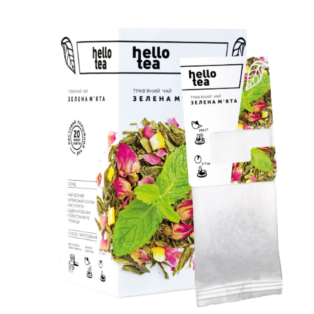 Чай "Зеленая Мята" Hello Tea - ароматный, нежный и освежающий напиток, дающий прохладу. Благодаря сочетанию мяты и зеленого чая «Сенча» этот чай обладает массой целебных свойств и придает силы. Это благородный и изысканный вкус для тех, кто выбирает только лучшее. Состав чая: чай зеленый китайский - Сенча, листья мяты перечной, цедра апельсина, лепестки цветов розы. Hello Tea - это украинский бренд чаев, создающий уникальные смеси из фруктов, цукатов, трав и специй. Но кроме особых смесей вы найдете в их ассортименте и традиционные зеленые и черные чаи. Количество штук в упаковке: 20 шт.
