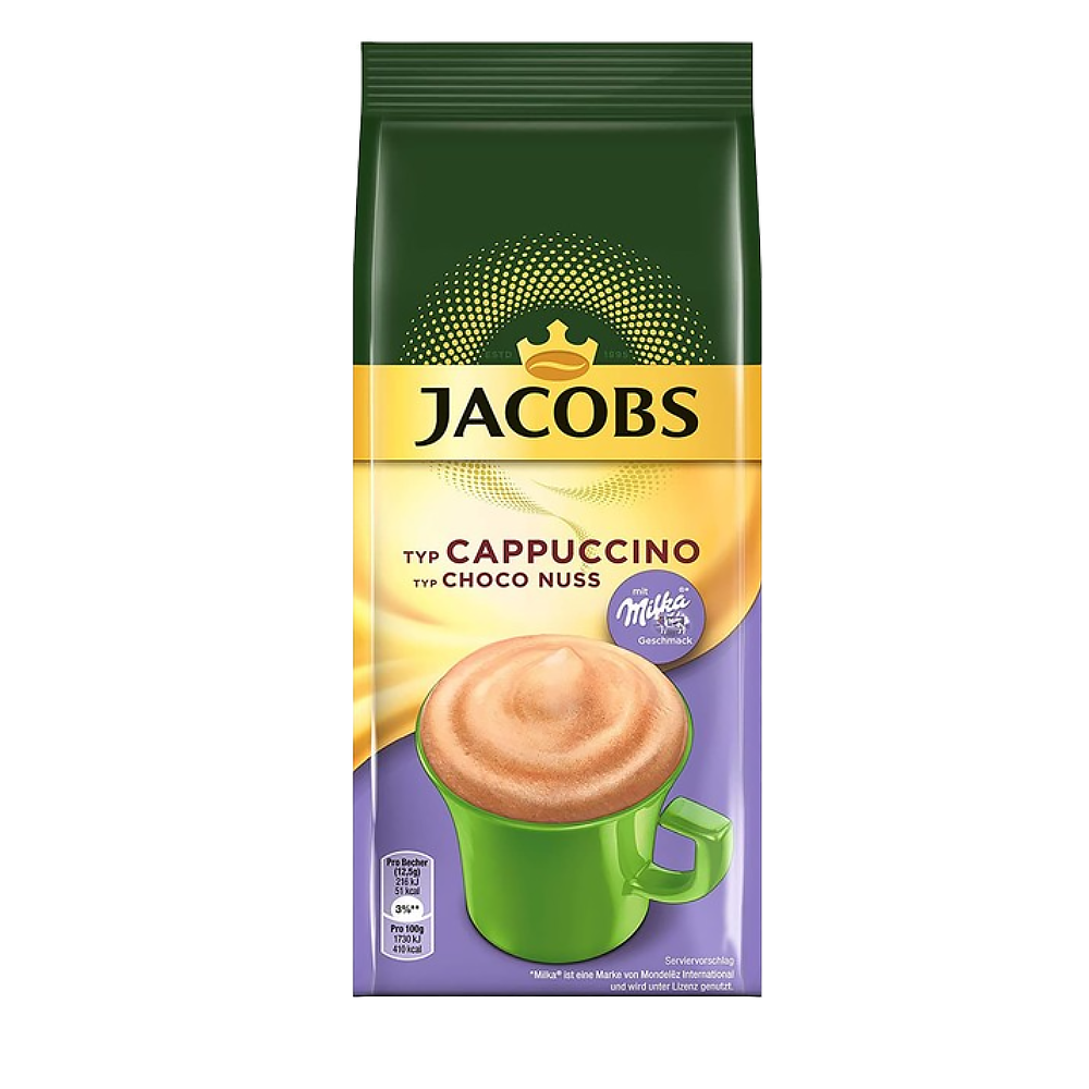 Jacobs Typ Cappuccino Choco Nuss – это идеальное сочетание растворимого кофе с нежностью шоколада Milka, дающие в результате вкусные шоколадные Капучино со слегка ореховым вкусом с красивой пеной.